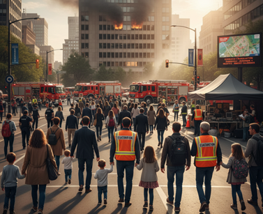 2. Préparation : Ensemble d'activités et de mesures prises à l'avance pour assurer une réponse efficace en cas de catastrophe.Exemples : Élaboration de plans d'urgence, exercices d'évacuation, constitution de stocks de secours, formation des équipes d'intervention, mise en place de systèmes d'alerte précoce. Élaboration de plans d'urgence : Ce sont les feuilles de route qui dictent qui fait quoi, quand et comment, lors d'une catastrophe. Ils couvrent l'évacuation, les communications, la gestion des abris, les soins médicaux d'urgence, etc.Exercices d'évacuation : Ces simulations pratiques sont vitales pour s'assurer que les plans fonctionnent et que les populations et les intervenants savent comment agir. Ils permettent d'identifier les lacunes et d'améliorer les procédures.Constitution de stocks de secours : Avoir des réserves d'eau, de nourriture, de médicaments, de couvertures et d'équipements de première nécessité est essentiel pour soutenir les victimes et les équipes d'intervention dans les premières heures et jours, avant que l'aide externe ne puisse être pleinement acheminée.Formation des équipes d'intervention : Pompiers, secouristes, personnel médical, forces de l'ordre, volontaires... tous doivent être formés et équipés pour intervenir rapidement et efficacement dans des situations de crise.Mise en place de systèmes d'alerte précoce : Bien que souvent aussi une mesure de mitigation, un système d'alerte précoce efficace est fondamental pour la préparation. Il permet de déclencher les plans d'urgence et de donner le temps nécessaire aux populations pour se mettre en sécurité ou prendre des mesures protectricesUne bonne préparation est directement liée à la capacité d'une communauté ou d'un pays à faire face à une catastrophe et à en réduire les conséquences humaines et matérielles. Elle transforme l'incertitude en actions coordonnées.Voici une illustration d'un exercice d'évacuation d'urgence.