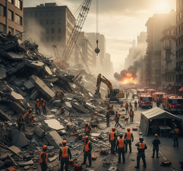 3. Réponse : Les actions immédiates entreprises lors ou juste après une catastrophe pour sauver des vies, réduire l'impact sur la santé, assurer la sécurité publique et répondre aux besoins fondamentaux des populations affectées.Exemples : Opérations de recherche et de sauvetage, aide humanitaire, évacuation des blessés, fourniture d'abris temporaires. Opérations de recherche et de sauvetage (SAR - Search and Rescue) : C'est souvent la première action critique après un effondrement de bâtiment, un glissement de terrain ou une inondation. Des équipes spécialisées interviennent pour localiser et extraire les victimes piégées.Aide humanitaire : Cela englobe la distribution rapide de nourriture, d'eau potable, de médicaments, de produits d'hygiène et d'autres articles de première nécessité aux populations affectées qui ont perdu l'accès à leurs ressources habituelles.Évacuation des blessés : Mise en place de chaînes d'évacuation médicale pour transporter les personnes blessées vers les centres de soins appropriés, souvent dans des conditions difficiles.Fourniture d'abris temporaires : Lorsque les maisons sont détruites ou inhabitables, il est crucial d'offrir rapidement des abris sûrs (tentes, gymnases, bâtiments publics) pour protéger les personnes des intempéries et leur offrir un minimum de dignité. La phase de réponse est le moment où toutes les ressources humaines, matérielles et organisationnelles préparées sont mobilisées à pleine capacité. Une réponse bien coordonnée peut faire la différence entre une crise gérable et une catastrophe humanitaire majeure.Voici une image illustrant des opérations de recherche et de sauvetage après un événement majeur.