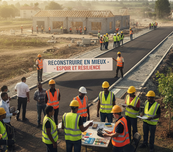 4. Rétablissement / Reconstruction : Processus de retour à la normale, incluant la réparation et la reconstruction des infrastructures, la relance économique, le soutien psychosocial et la reconstruction des moyens de subsistance des populations affectées. C'est aussi une phase d'opportunité pour "reconstruire en mieux" et réduire la vulnérabilité future.Exemples : Réhabilitation des routes, écoles et hôpitaux, programmes de microcrédit pour les agriculteurs, formation aux techniques de construction résilientes. Réhabilitation des routes, écoles et hôpitaux : La restauration des infrastructures vitales est fondamentale pour que la vie puisse reprendre son cours normal. Des routes fonctionnelles permettent l'acheminement des biens et des services, les écoles sont essentielles pour l'éducation des enfants, et les hôpitaux pour la santé publique.Programmes de microcrédit pour les agriculteurs : Ceci illustre le soutien à la relance économique et à la reconstruction des moyens de subsistance. Les agriculteurs ayant perdu leurs récoltes ou leur bétail ont besoin de capital pour recommencer, et le microcrédit peut être une solution adaptée.Formation aux techniques de construction résilientes : C'est un exemple parfait de "reconstruire en mieux". Plutôt que de simplement reconstruire à l'identique, cette approche intègre les leçons tirées de la catastrophe pour bâtir des structures plus résistantes aux aléas futurs, intégrant des codes parasismiques améliorés ou des matériaux résistants aux inondations, par exemple.La phase de rétablissement n'est pas seulement une question de "retour à la normale", mais plutôt de "construire une nouvelle normalité" qui est plus sûre, plus résiliente et, si possible, plus équitable.Voici une image illustrant la reconstruction d'une ville après une catastrophe, avec l'idée de "reconstruire en mieux".