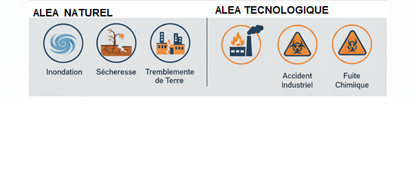 Aléa (Hazard) :Un aléa est un phénomène, une substance, une activité humaine ou une condition qui peut causer des pertes en vies humaines, des blessures ou d'autres impacts sur la santé, des dommages aux biens, des pertes de moyens de subsistance et de services, des perturbations sociales et économiques, ou des dommages à l'environnement (UNISDR, 2015). Il peut être naturel (inondation, sécheresse, tremblement de terre) ou technologique (accident industriel).Exemple : En Côte d'Ivoire, les fortes pluies saisonnières représentent un aléa hydrométéorologique majeur (CEE, 2012).