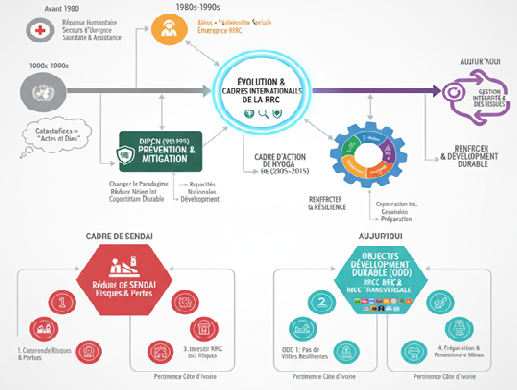 Aujourd'hui, l'accent est mis sur une gestion intégrée des risques, qui combine toutes les phases du cycle (prévention, préparation, réponse, rétablissement) et intègre la RRC dans les politiques de développement durable.Cadres internationaux (Sendai, ODD) (7 min)Cadre de Sendai pour la Réduction des Risques de Catastrophe (2015-2030) : Adopté par 187 États membres de l'ONU, y compris la Côte d'Ivoire, le Cadre de Sendai est le successeur du Cadre d'action de Hyogo. Il représente l'accord international le plus important sur la RRC.Objectif principal : Réduire de manière substantielle les risques de catastrophe et les pertes dues aux catastrophes (UNISDR, 2015).Quatre priorités d'action :Comprendre le risque de catastrophe.Renforcer la gouvernance des risques de catastrophe pour gérer les risques.Investir dans la réduction des risques de catastrophe pour la résilience.Améliorer la préparation aux catastrophes pour une réponse efficace et "reconstruire en mieux" durant le rétablissement, la réhabilitation et la reconstruction.Pertinence pour la Côte d'Ivoire : Le Cadre de Sendai guide les politiques nationales ivoiriennes en matière de prévention et de gestion des catastrophes, encourageant une meilleure évaluation des risques et un investissement accru dans la résilience.Objectifs de Développement Durable (ODD) : Adoptés en 2015 par l'ONU, les 17 ODD sont un appel universel à l'action pour éradiquer la pauvreté, protéger la planète et garantir la prospérité pour tous. La RRC est transversale à de nombreux ODD, reconnaissant que les catastrophes peuvent anéantir des décennies de progrès en matière de développement (UNDP, 2015).